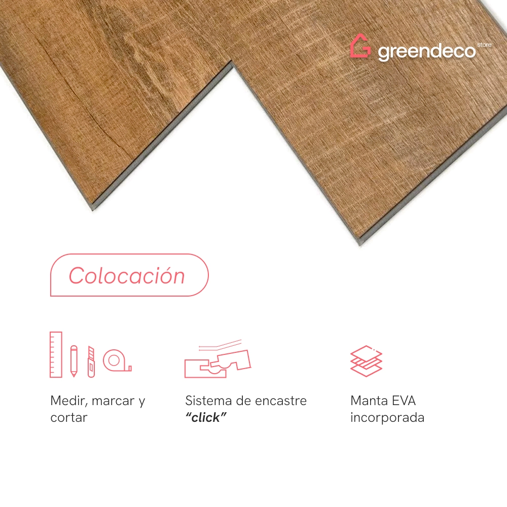 Tip greendeco: Para colocarlos, es importante tener la superficie nivelada. NO recomendamos utilizar manta de poliuretano con pisos SPC sistema click. NO recomendamos instalar pisos vinílicos sobre pisos de parquet o superficies de madera, ya que actúan como una barrera que impide que la misma “respire”. Esto puede generar problemas de humedad causando el inflado de la madera, lo que afectaría al piso vinílico. Recomendamos sumar un 10% extra por desperdicio, a la cantidad total de producto necesario. Ejemplo: superficie de 3×3 = 9m2 + 10% = 9,9m2.